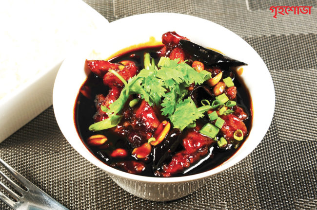 উপকরণ: ৮০০ গ্রাম চিকেনের থাইয়ের অংশ ছোটো টুকরো করে কাটা, ২ কোয়া রসুন কুচি করা, ১০ গ্রাম আদাকুচি, ৪টে শুকনো লংকা, ২ বড়ো চামচ সোয়াসস, ১ ছোটো চামচ তিল তেল, ২ বড়ো চামচ ওয়াইন, বাদাম তেল প্রয়োজনমতো, ১/২ কাপ কাঁচাবাদাম, ১ ছোটো চামচ কর্নফ্লাওয়ার, ৬০ মিলি চিকেন স্টক, ১/২ ছোটো চামচ চাইনিজ ফাইভ স্পাইস, ৪টে সবুজ পেঁয়াজ পাঁচ সেন্টিমিটার টুকরোয় কাটা, সাজাবার জন্য ধনেপাতা আর পেঁয়াজের রিং।