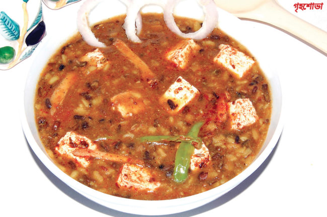 উপকরণ: ১ কাপ ছোলার ডাল, ১০০ গ্রাম পনির, ১ চামচ আদাকুচি, ১ চামচ কাঁচালংকার কুচি, ২ চামচ টম্যাটো পেস্ট, ২ চামচ পেঁয়াজবাটা, ১ চামচ লেবুর রস, ১ চামচ গোটা জিরে, ১ চামচ ধনেগুঁড়ো, সামান্য কালোজিরে, ৩-৪টি লবঙ্গ, আধা চামচ হলুদগুঁড়ো, আধা চামচ লাল লংকার গুঁড়ো, আধা চামচ পাঁচফোড়ন, আধা চামচ আমচুর, আধা চামচ গরমমশলা, ১ চামচ ঘি এবং নুন স্বাদমতো।