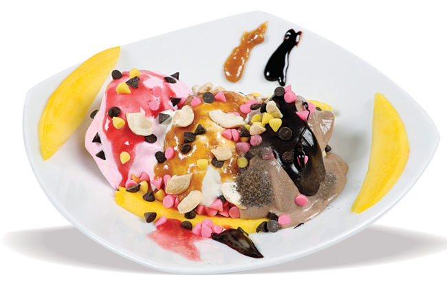 উপকরণ: ২টো কলা গোলগোল করে কাটা, ১ কাপ ভেনিলা কাস্টার্ড, ১৫০ মিলিলিটার ফেটানো ক্রিম, ১ বড়ো চামচ চকোলেট ক্রিম, সাজানোর জন্য কলা কুচি করে কাটা, চকোলেট দানা, দু'টুকরো আম, কাজুবাদামের কুচি এবং গোলমরিচের গুঁড়ো।