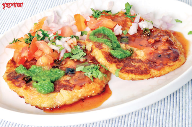 প্রণালী: স্লাইস ব্রেডগুলো জলে চুবিয়ে নিয়ে তুলে রাখুন ২ মিনিট। ব্রেড-এর গা থেকে জল ঝরে গেলে, ওর সঙ্গে সেদ্ধ আলু, কাঁচালংকাকুচো, জিরেগুঁড়ো, গোলমরিচের গুঁড়ো, আদাকুচি, চাটমশালা এবং বেসন ভালো ভাবে চটকে মিশিয়ে নিন। এবার ওই মিশ্রণকে ছোটো ছোটো চ্যাপ্টা আকার দিয়ে রাখুন। এরপর ফ্রাইং প্যান-এ তেল গরম করে হালকা আঁচে ভাজুন এবং বাদামি বর্ণ ধারণ করলে নামিয়ে নিন। ওর উপর বিটনুন, পেঁয়াজকুচি, টম্যাটোকুচি ছড়িয়ে দিয়ে, ধনেপাতার চাটনি এবং তেঁতুলের লেই সহযোগে গরম গরম পরিবেশন করুন।