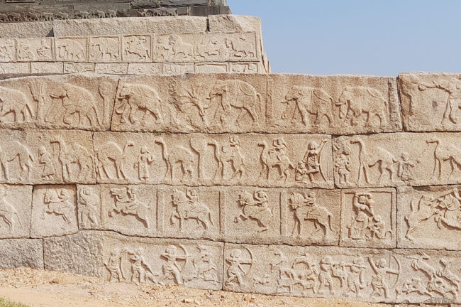 আসা যাওয়াতে দুই দুই চার কিলোমিটার পথ পায়ে হেঁটে বেশ খারাপ অবস্থা হয়েছিল। জনপ্রতি ১৫০০ টাকায় সাফারির আলাদা ব্যবস্থা আছে। আমরা ওই হাঁটাপথেই চিড়িয়াখানায় ঘুরলাম। ভারতীয় নেকড়ে, নীল নেকড়ে, কাকাতুয়া, ময়ূর, জলহস্তী, জিরাফ, কচ্ছপ, কুমির, বাঘ ছাড়াও যাদের দেখে আনন্দ পেয়েছি, তারা হল কালো রাজহাঁস। কুচকুচে কালো শরীরে টকটকে লাল ঠোঁট ওদের দারুণ আকর্ষণীয় করেছিল। রোদের তাপ থেকে বাঁচতে প্রায় সব পশুপাখিই ছায়ায় আশ্রয় নিয়েছিল। ফেরার পথটা যখন মনে হচ্ছিল শেষ হওয়ার নয়, তখন চিড়িয়াখানার এক কর্মী তার জিপে উঠিয়ে গেট পর্যন্ত ছেড়ে দিয়ে অশেষ উপকার করলেন। সময় যেহেতু বাঁধা, তাই হাম্পি বাজারের উদিপি হোটেলে দক্ষিণ ভারতীয় থালি খেয়ে আবার আমাদের গাড়ি ছুটল রাজা ও রানিদের রেখে যাওয়া ভগ্ন স্থাপত্যের দিকে। আনজান্যা পর্বতের শীর্ষে অবস্থিত হনুমানমন্দির হিন্দুদের একটা বিখ্যাত মন্দির। পাঁচশো সিঁড়ি চড়ে এই যাত্রায় ওই মন্দিরটাতে পৌঁছাতে পারিনি।